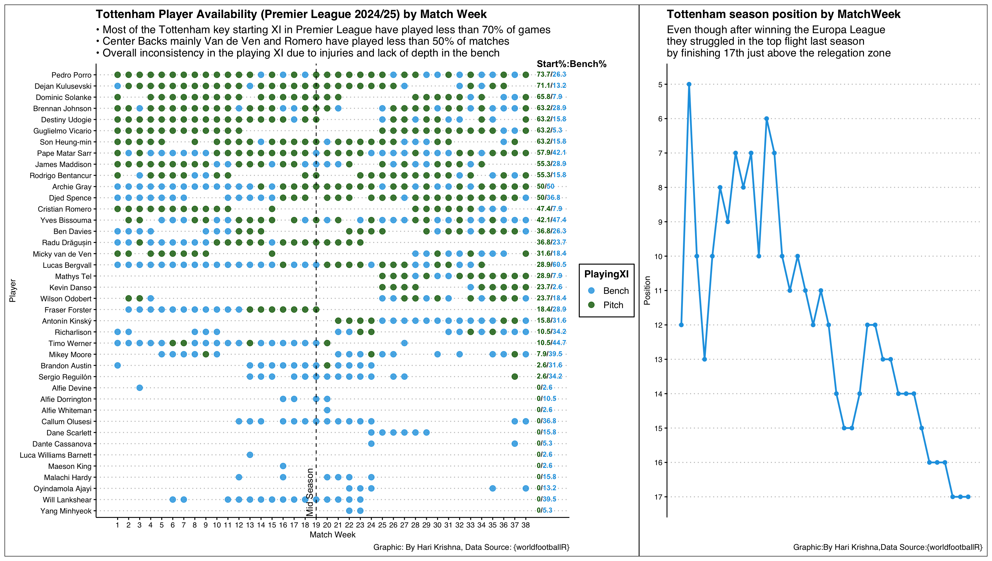 Left chart: Each dot represents whether a Tottenham player started or was benched in a particular matchweek (1–38). It highlights the instability and rotation forced by injuries.