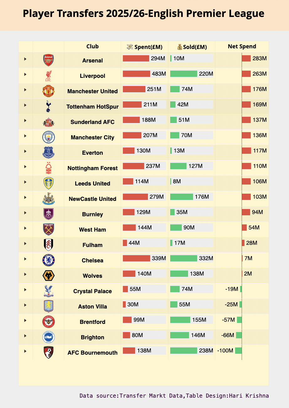 This project is my submission to the Posit Table Contest. It presents an data exploration of all incoming and outgoing player transfers in the English Premier League (2025/26 season). The goal is to highlight spending trends, signings(incoming & Outgoing), and club-level comparisons, all in a clean and format.